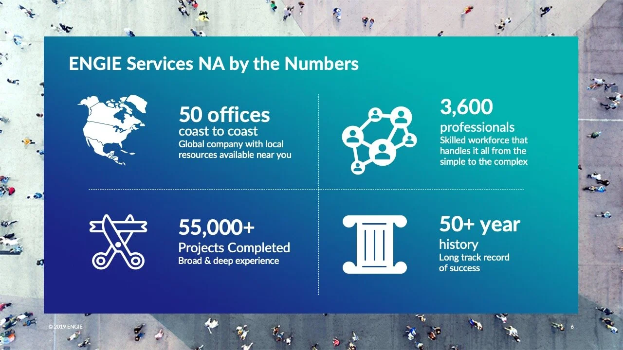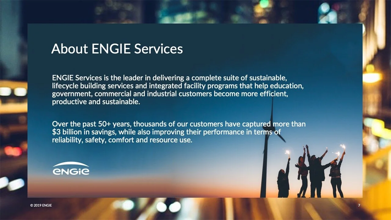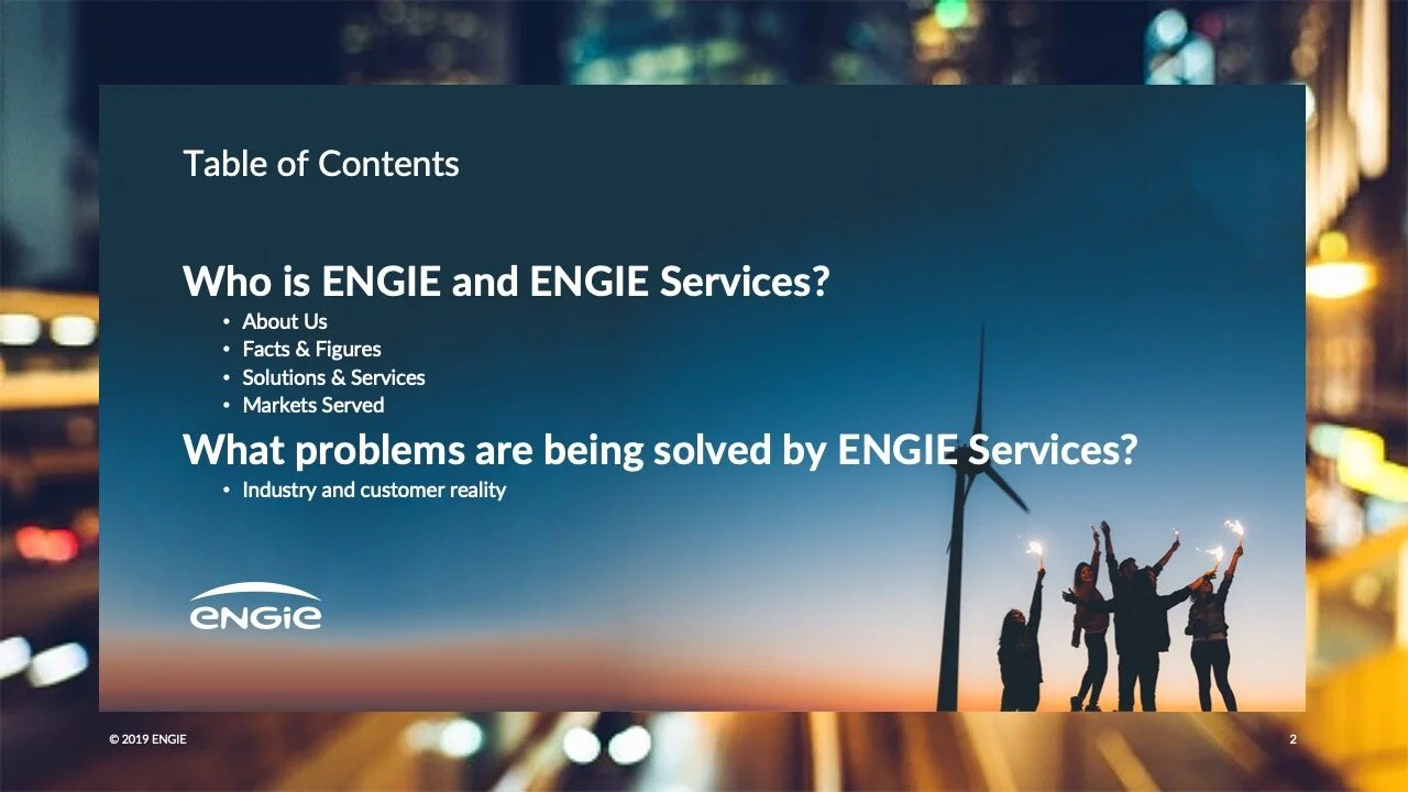This presentation provides a comprehensive overview of ENGIE Services North America. It is designed to serve as a foundational resource for Business Development Managers as they engage with prospective and existing customers. The content offers key insights into the company's structure, service offerings, market expertise, and value propositions. Business Development Managers can use this deck to introduce ENGIE’s capabilities, establish credibility, and tailor discussions based on the specific needs and interests of their audience. Whether initiating new relationships or deepening existing ones, this presentation sets the stage for meaningful, informed conversations that align ENGIE’s strengths with customer objectives.